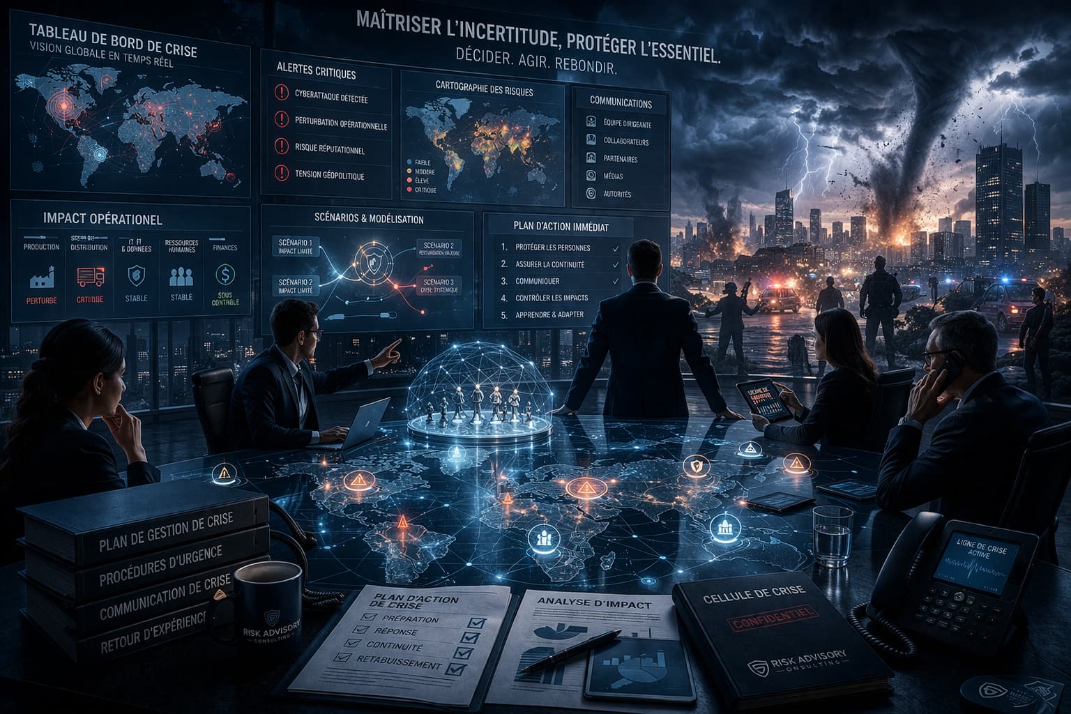 - Préparation : Anticipation des risques avec des plans d’urgence et des scénarios de gestion. Les organisations ou gouvernements établissent des équipes de gestion de crise et des plans d’action.